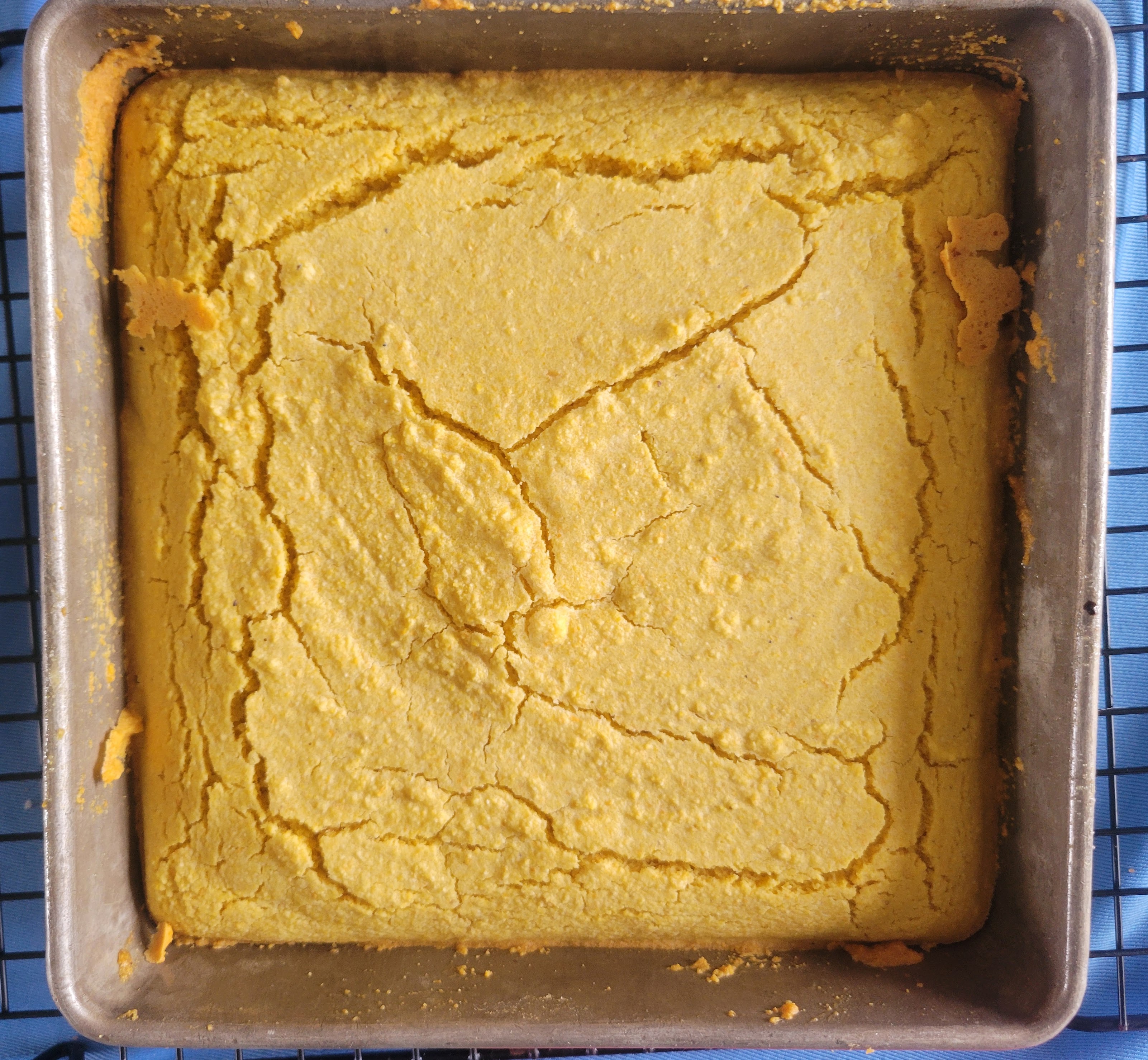 This cornbread recipe shows Malinda’s origins in the American South in the absence of sugar and the smaller amount of wheat flour than found in many (though not all) Northern recipes. It is also a very frugal recipe, using a very small amount of fat. The amount of baking soda is also notably small, resulting in a very dense bread.
