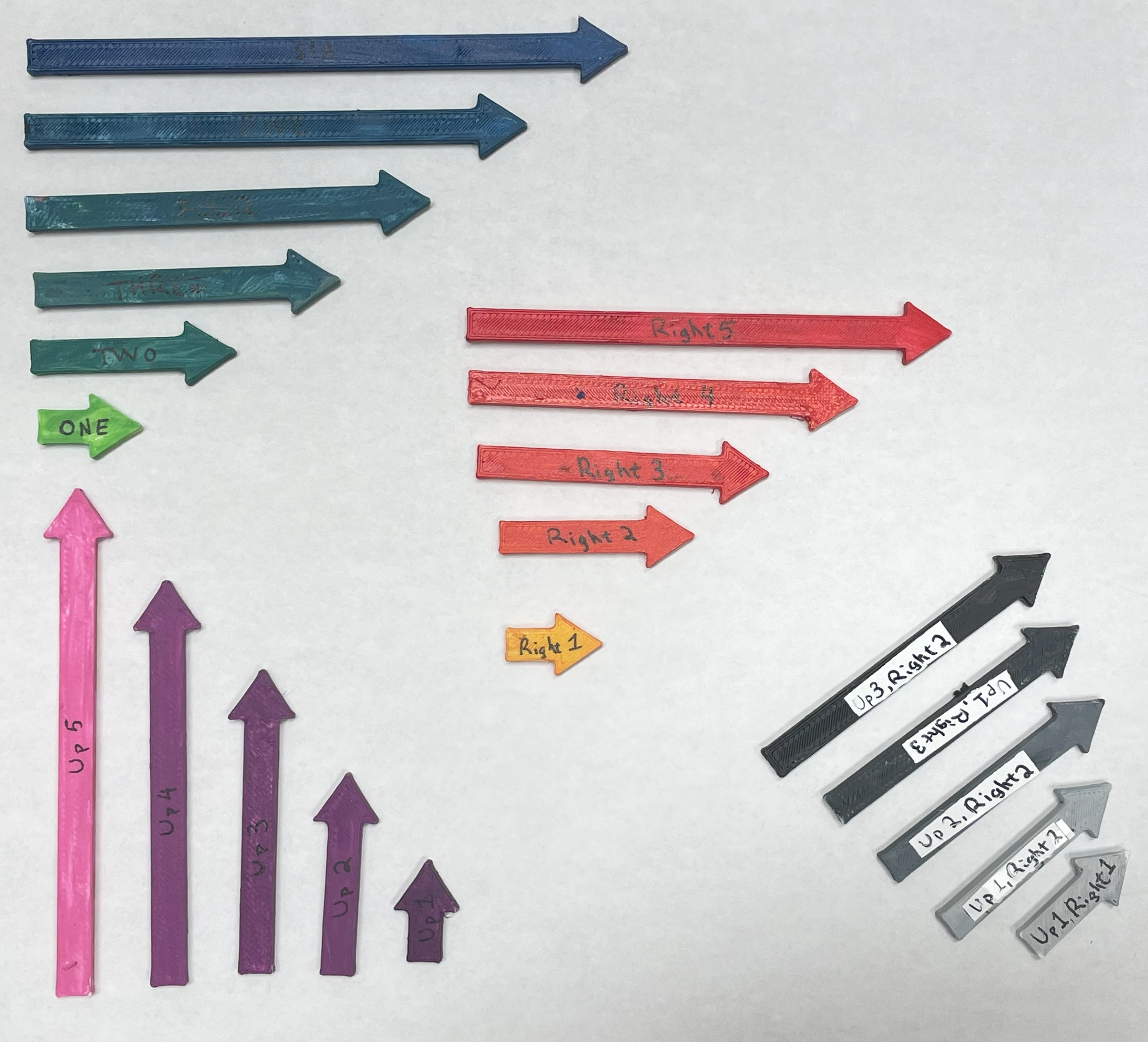 I used the 3D printer to print 21 little arrows of varying lengths. These were for an activity I designed and ran at a Scientist Spotlight event at the Museum of Natural History. In the activity, participants used the arrows to slide along gridlines and create mathematical objects called “semigroups.” The original printed arrows were white, but I later painted them in different colors and labeled them, to add some whimsy and help me keep track of which arrows were which lengths.
