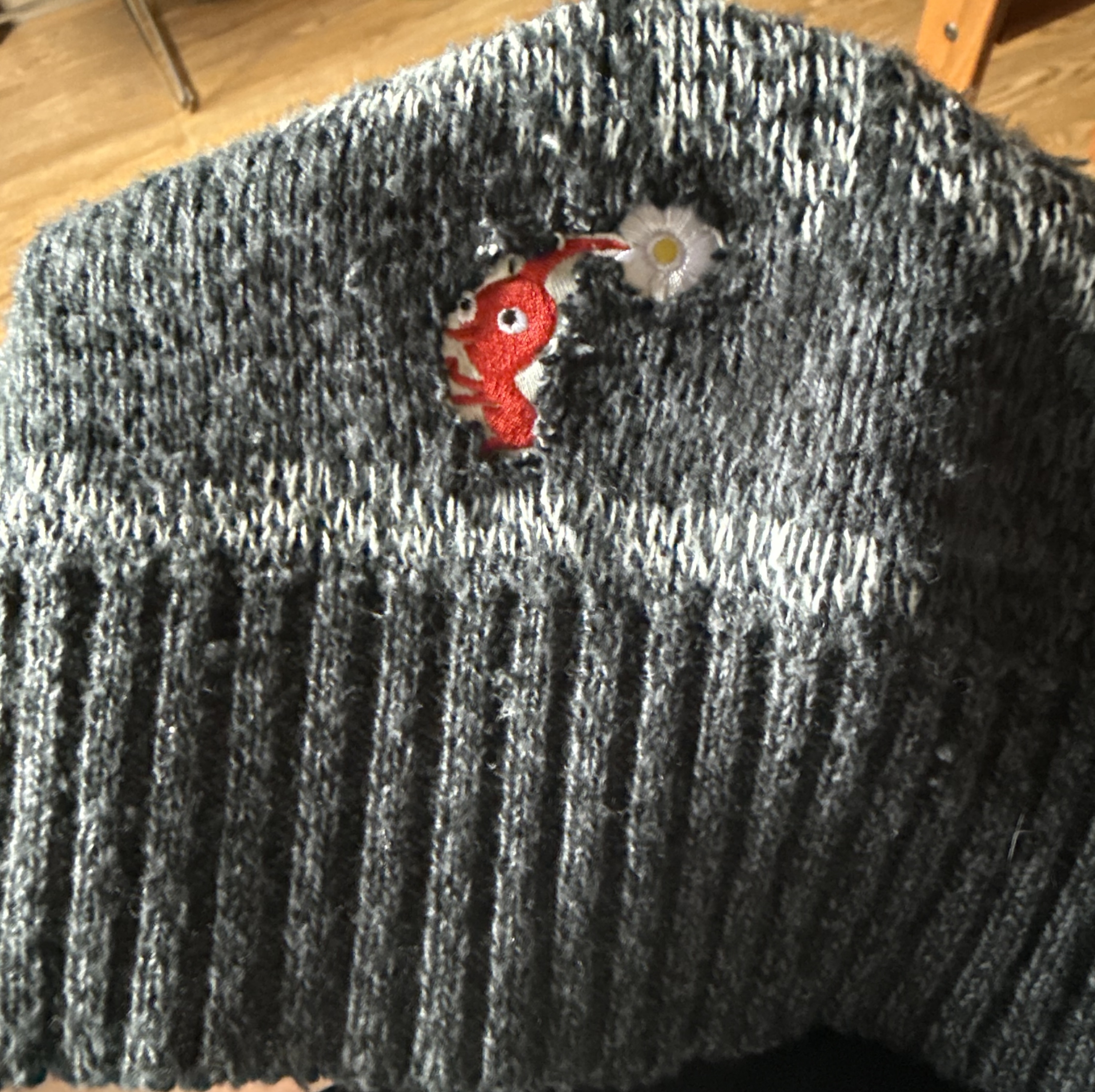 I have wanted to find ways to modify my clothing for years either because it didn’t fit the way I wanted it to or because there was a hole or other issue that made me not want to wear it. I decided that because I now had access to a sewing machine through the Shapiro Design Lab I would try to do that for the first time. I took a sweater of mine that I have loved dearly but that sadly had gotten a hole in it and decided that would be what I fixed. I knew I didn’t want to just close the hole like many online recommendations had said, partially because that would be boring and partially because I knew I wouldn’t be able to match the design and color. That led me to looking for other more fun ways to repair the hole which then reminded me I had a shirt that I loved but had stained accidentally so I stopped wearing it. This shirt had Pikmin embroidered onto it. I decided to cut out one of the Pikmin from the shirt and sew it onto the inside of the sweater to fill the hole and create a peek-a-boo visual with the Pikmin. This was likely not the best first sewing project but it worked out in the end. I spent 2 hours working on this project partially due to learning how to use a sewing machine and partially because sewing onto knit fabric is not the easiest project. Overall I am very happy with this sweater and look forward to sewing the rest of the Pikmin onto other things and further mending my clothes to lengthen their lifetimes.